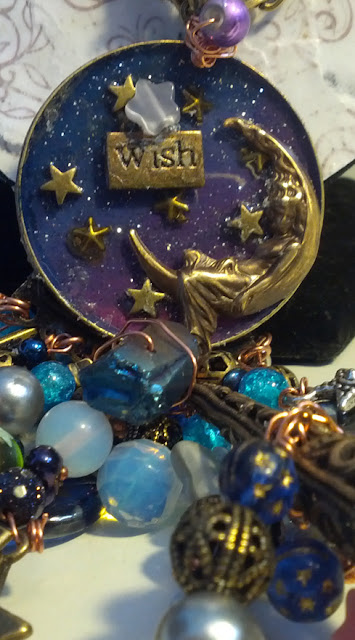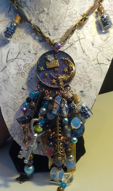 I basically threw on everything that I liked on this. Blue beads, opalite, star beads, little bottles, keys… You know, everything but the kitchen sink ! My first attempt was too ambitious – it was too heavy to wear ! So I had to take everything off and start over.