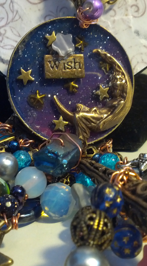 I basically threw on everything that I liked on this. Blue beads, opalite, star beads, little bottles, keys… You know, everything but the kitchen sink ! My first attempt was too ambitious – it was too heavy to wear ! So I had to take everything off and start over.